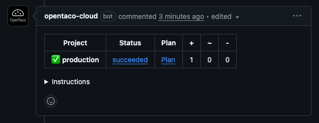 Add a new PR comment:Confirm the apply job runs and the apply result is posted back to the pull request.